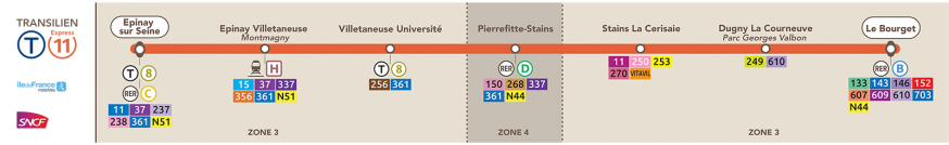 Le Tram 11 express est une ligne en rocade au nord de Paris qui permettra aux voyageurs, à terme, de se déplacer rapidement de banlieue à banlieue. Sur 28 km prévus à terme entre Sartrouville et Noisy-le-Sec, 11 km ont été mis en service en 2017, entre Epinay-sur-Seine et Le Bourget.